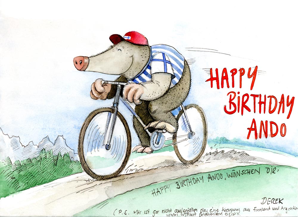 This is a birthday present for a friend of mine, who is half Argentinean, half Finn. So I decided to do a mole (no special reason, I just like moles) on a racing bicycle (Ando loves racing bicycles). wearing an Argentinean football jersey with a small Finland flag. What I didn´t think of is that when you combine the two you will get a Greek flag.