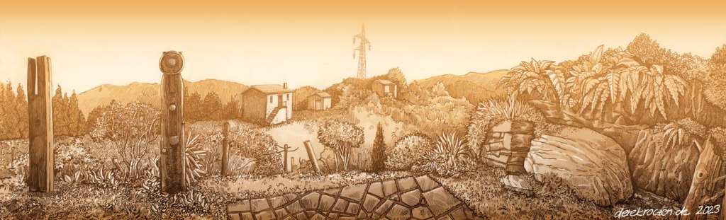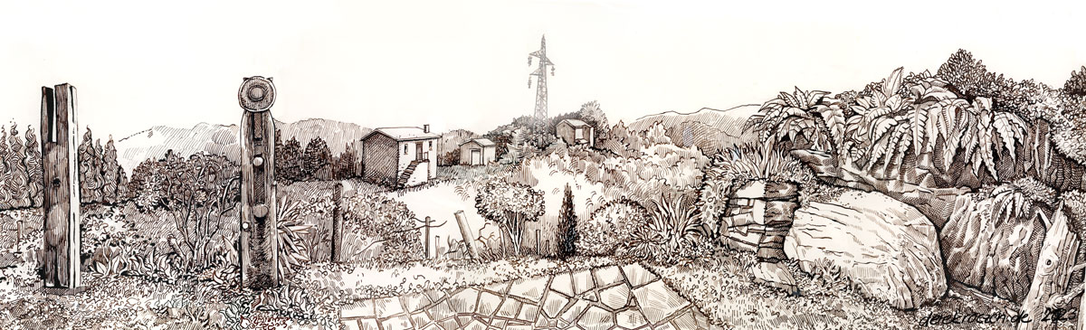 Christmas card for my family, showing the view from Inge´s house in Italy (a pretty fanciful version of it). There is intentionally little Christmas in it.
