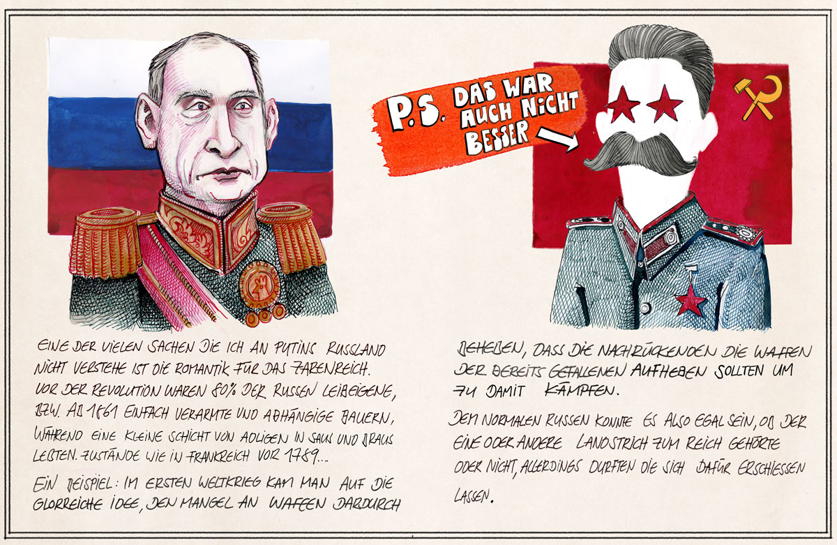 Some history lesson in German (I am sorry if that sounds megalomanical). I don´t get the romanticism surrounding tsardom. Being an ordinary Russian under the tsar was a pretty shitty experience. I should practice caricatures, I know…
