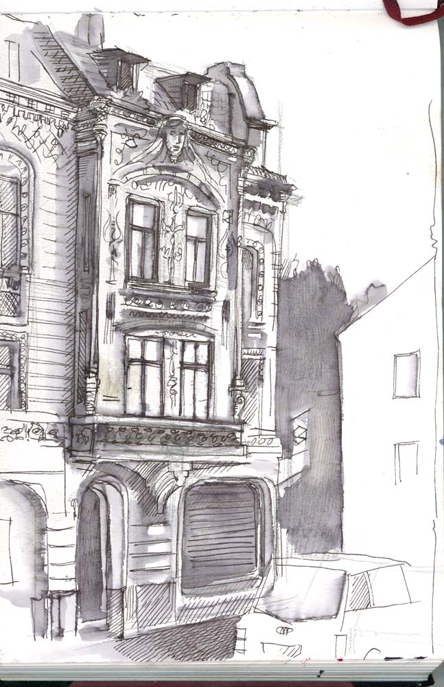 This is a house in Köln Nippes (probably Merheimerstr). I always enjoy sketching when abroad and don´t do that very often. So I thought I´ll just choose something around the corner. One of the worst things about looking for a place to draw is the lack of something to sit on. I made a lot of comparatively boring drawings because I had to compromise. Drawing something around the corner has the big advantage that you can bring a chair with you…